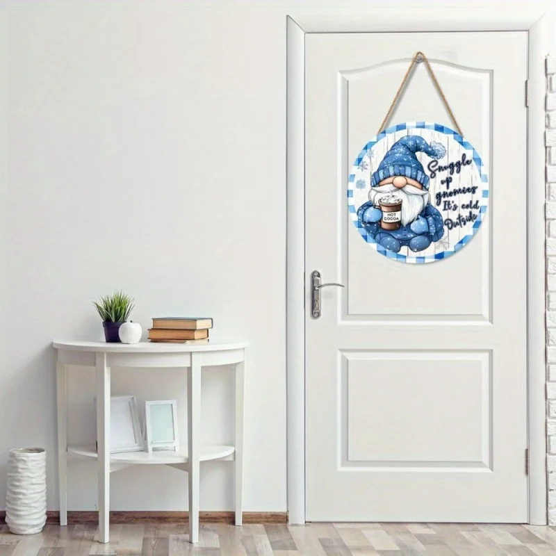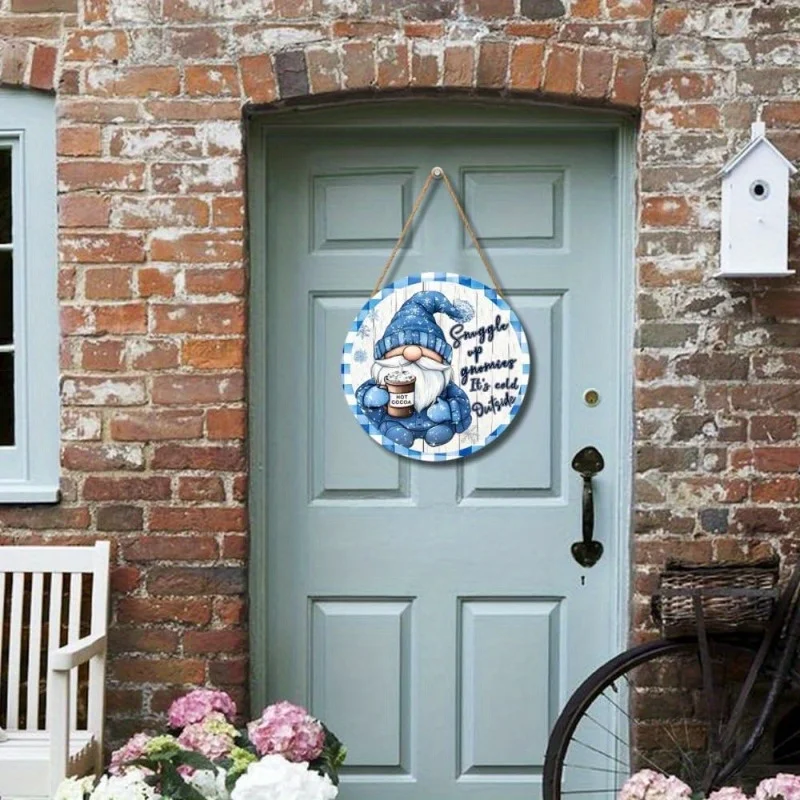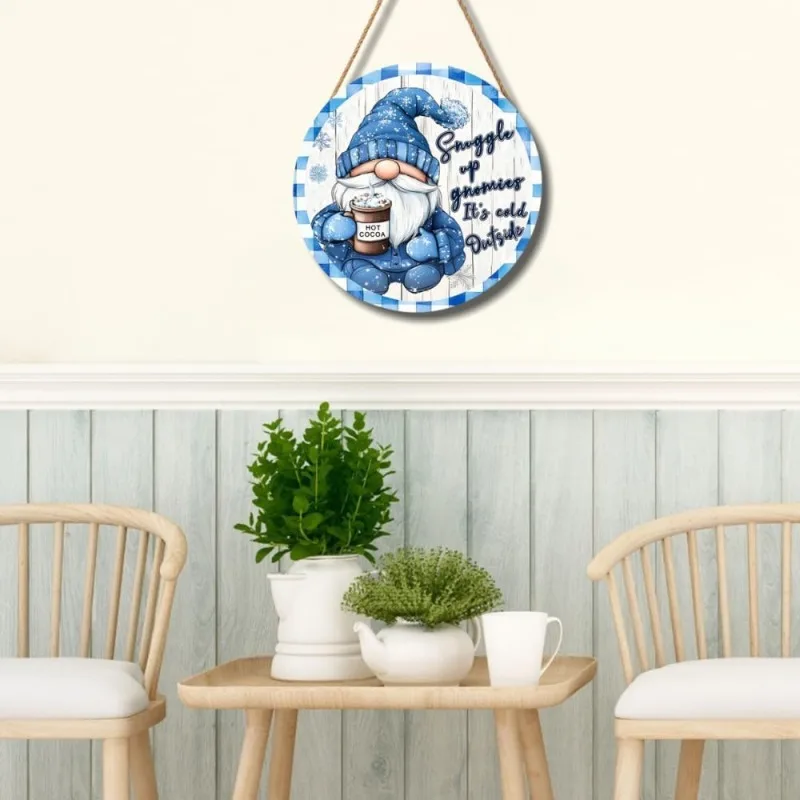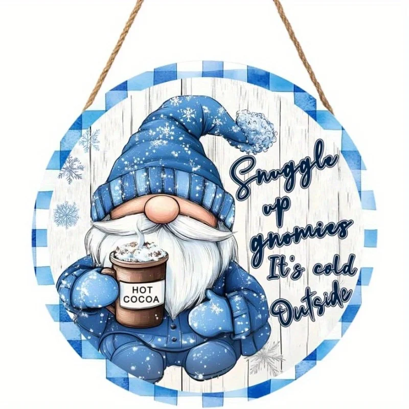 12-Inch Round Winter Gnome Door Hanger Sign “Snuggle Up Gnomes It’S Cold Outside” with Hot Cocoa Snowflakes Design