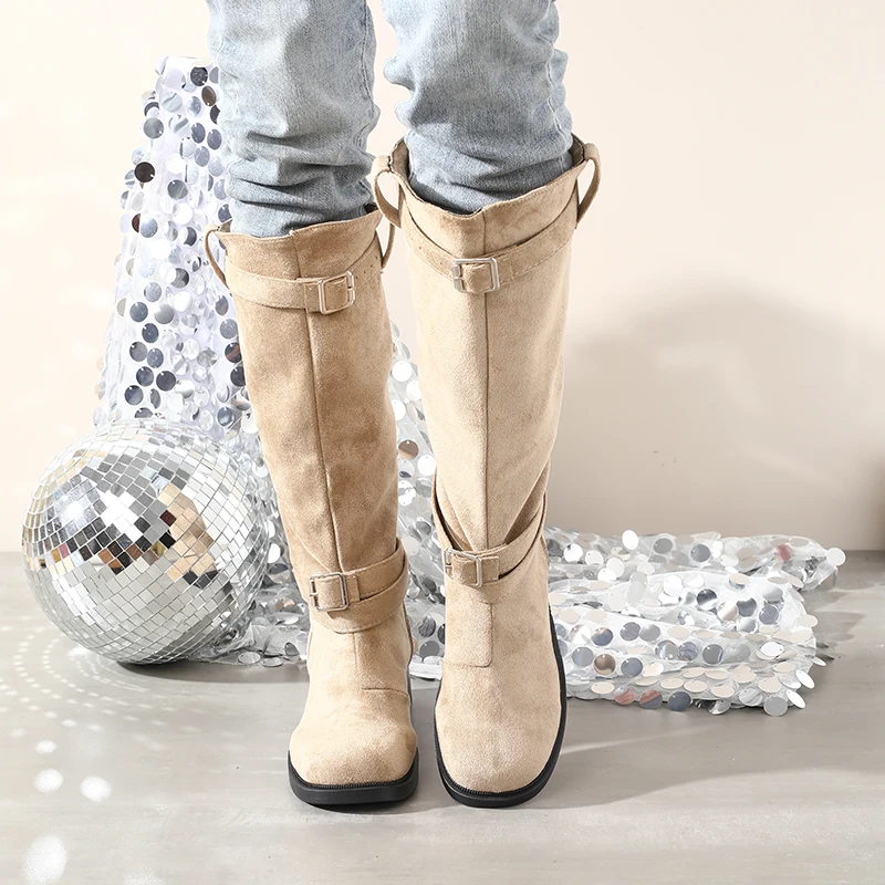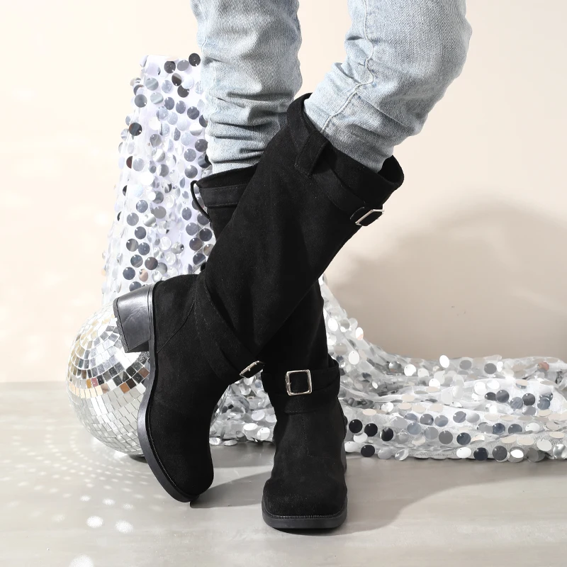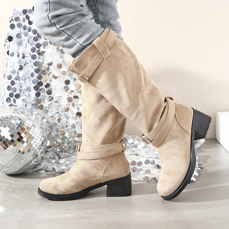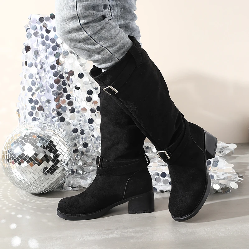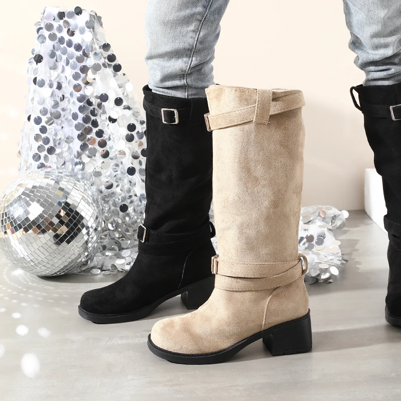 2025 New Women’s Mid-Calf Boots – Vintage Chunky Heel Belt Buckle Stretch Slimming Boots Winter Warm Suede Booties