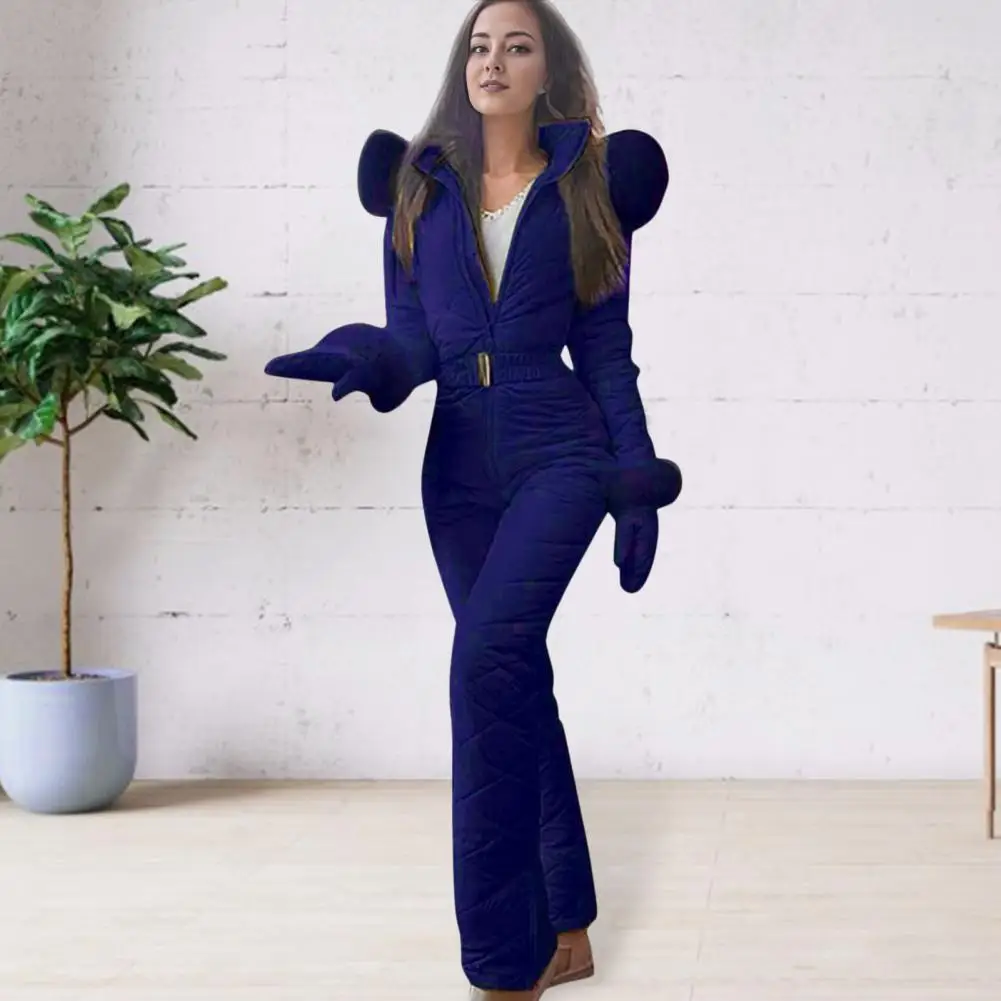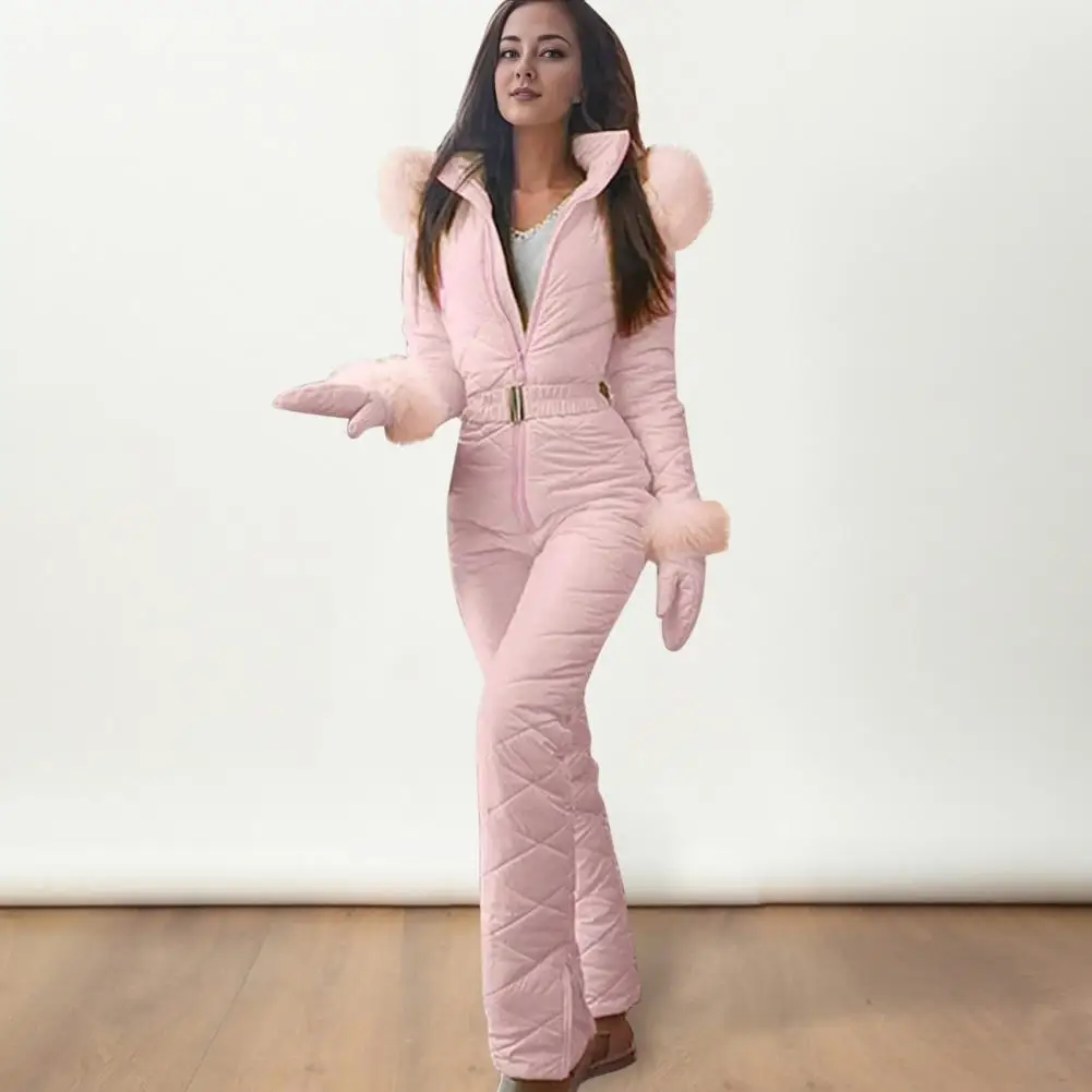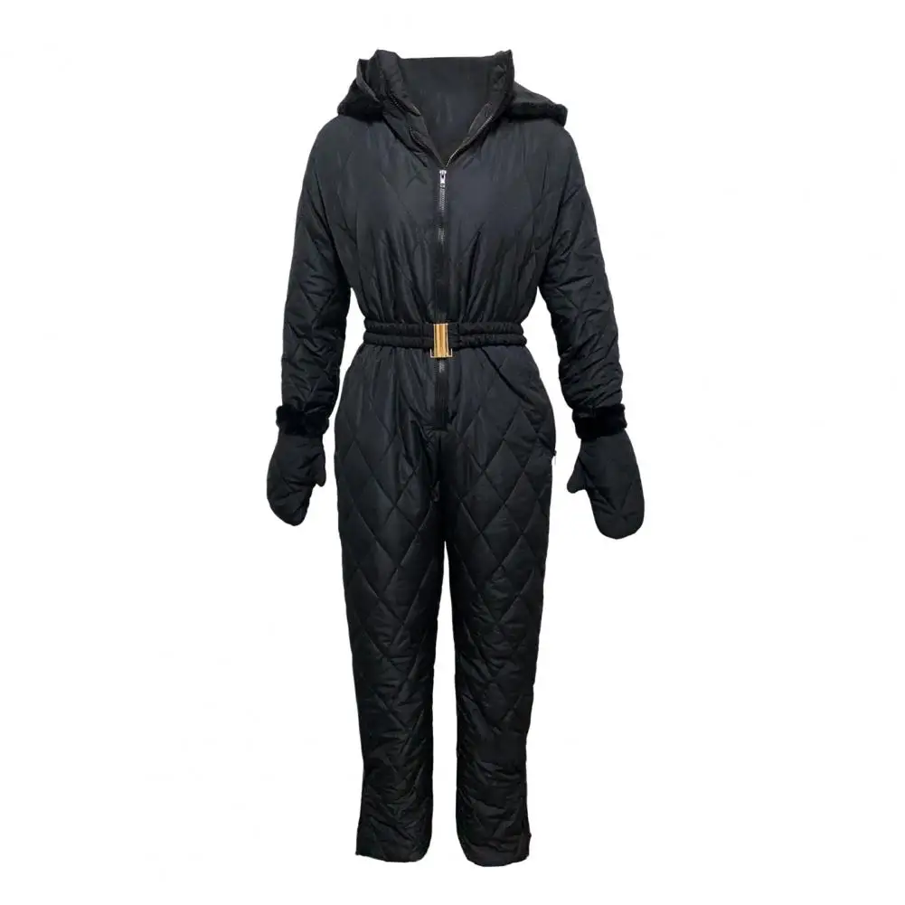 Women Winter Jumpsuit with Gloves Elastic Waist Thickened Padded Snowsuit Hooded Zipper Closure Windproof Outdoor Ski Outfit Waterproof Ice Snow Sports Jacket