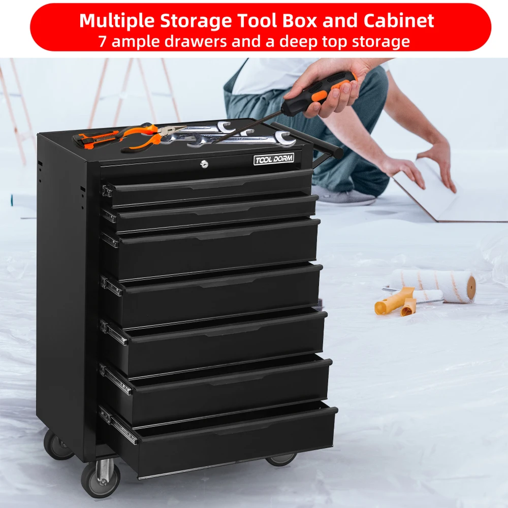 • Tool Cart loading weight: Drawers feature 100 lb load rated smooth ball bearing slides with hold-in detents, aluminum pulls, A high-capacity rolling tool cabinet with 7 drawers Up to total 700Lbs Capacity.