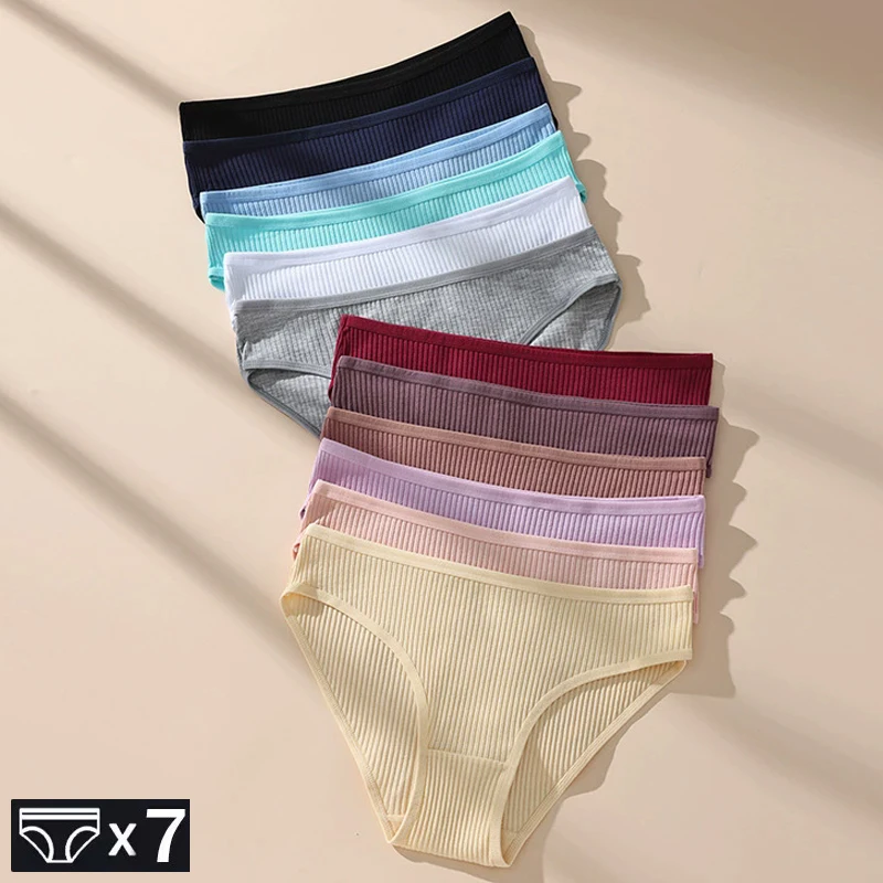 7Pcs Women's Panties Striped Briefs for Women Low-Rise Breathable Cotton Female Soft Underwear Solid Colors Ladies Underpants