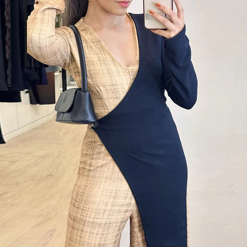 Autumn Color Blocked Long Sleeved Romper Fashion Women’s V-neck High Waisted Office Jumpsuit New Casual Button Wide Leg Playsuit