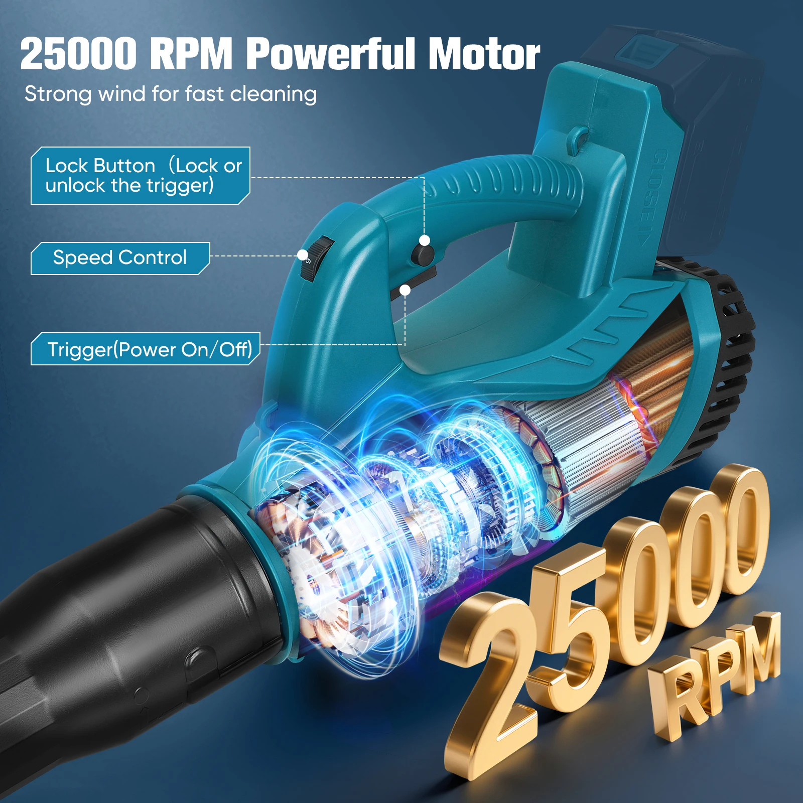 This leaf blower features a powerful motor, delivering speeds of up to 25,000 RPM for effective cleaning. The cordless design removes the hassle of tangled cords, offering greater mobility and convenience.