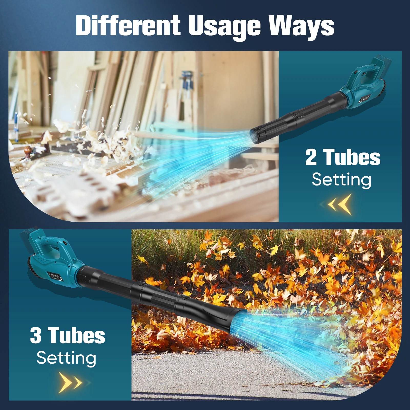Our leaf blower combines power and convenience for effortless outdoor cleaning. Its 25,000 RPM motor generates winds up to 297 km/h, making it ideal for stubborn dirt, wet leaves, or drying surfaces. 6-speed control lets you switch between gentle dusting and powerful debris clearing. The trigger and lock button keep continous airflow steady for extended tasks. The 3 included tube nozzles adapt to different jobs: the round nozzle targets tough spots, while the flat nozzle covers large areas quickly. Lightweight (4.18 lbs) with a comfortable shoulder strap—no more arm strain during long cleanups. Compatible with MAKITA 18V lithium batteries (BL1815N/BL1830/BL1840), this blower offers long runtime without tangled cords. (Note: Not compatible with G-series batteries). Perfect for gardens, patios, driveways, and more—get the job done faster and easier!