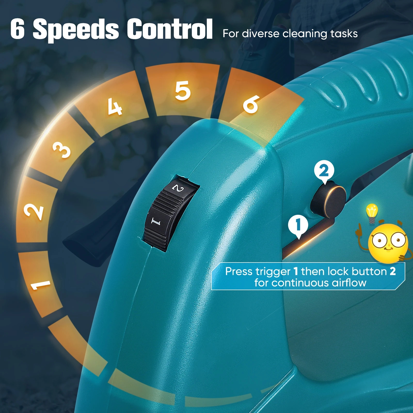 With six adjustable wind speeds, you can tailor the airflow to suit different tasks—from light dusting to clearing heavier debris. The maximum wind speed reaches 297 km/h for demanding jobs. Press the trigger and then press lock button for continuous airflow, reducing fatigue during extended use.