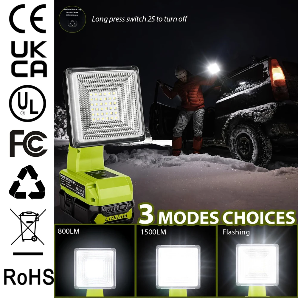 Cordless LED Work Light for Ryobi 18V Battery 25W 1500LM LED Floodlight with USB-A&USB-C 2.1A Fast Charging Ports 3 Lighting Modes for Jobsite Car Repairing Camping Emergency【Battery not included】
