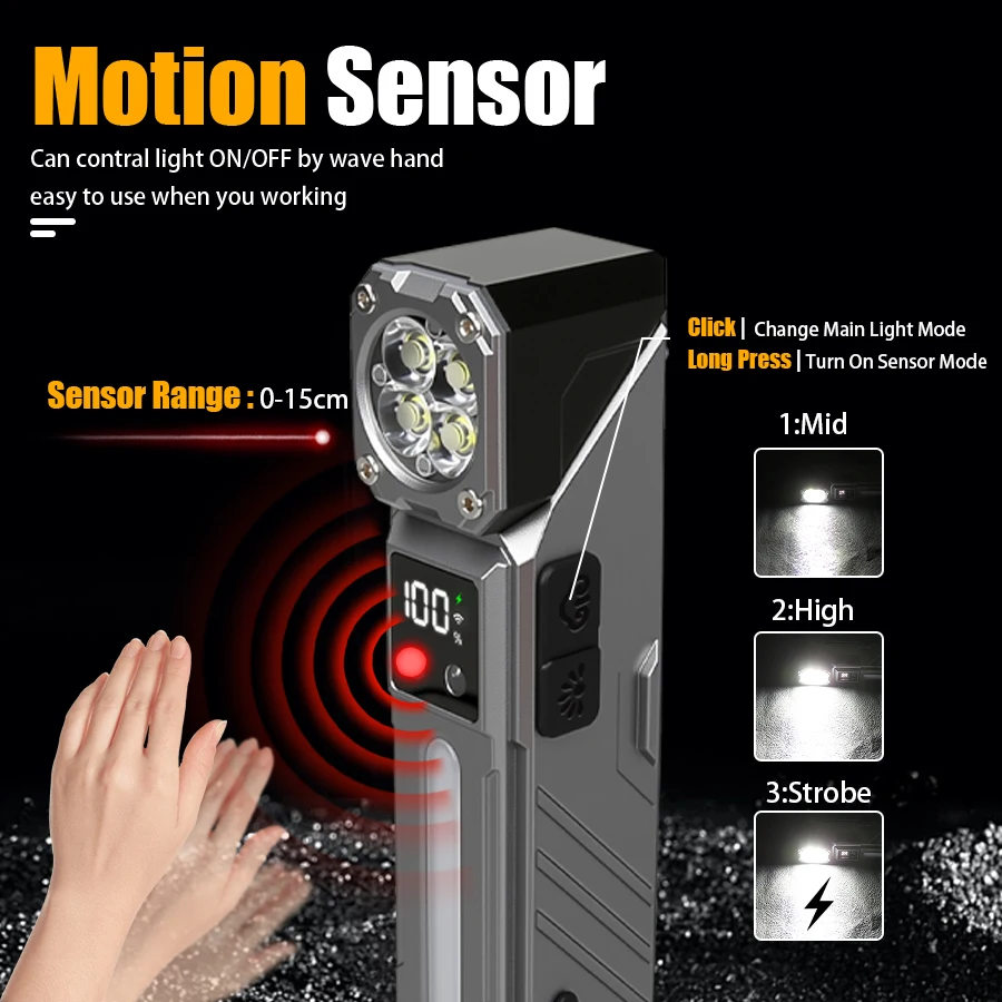 Multi functional flashlight: with Sensor,magnet, RGB side lights, clip