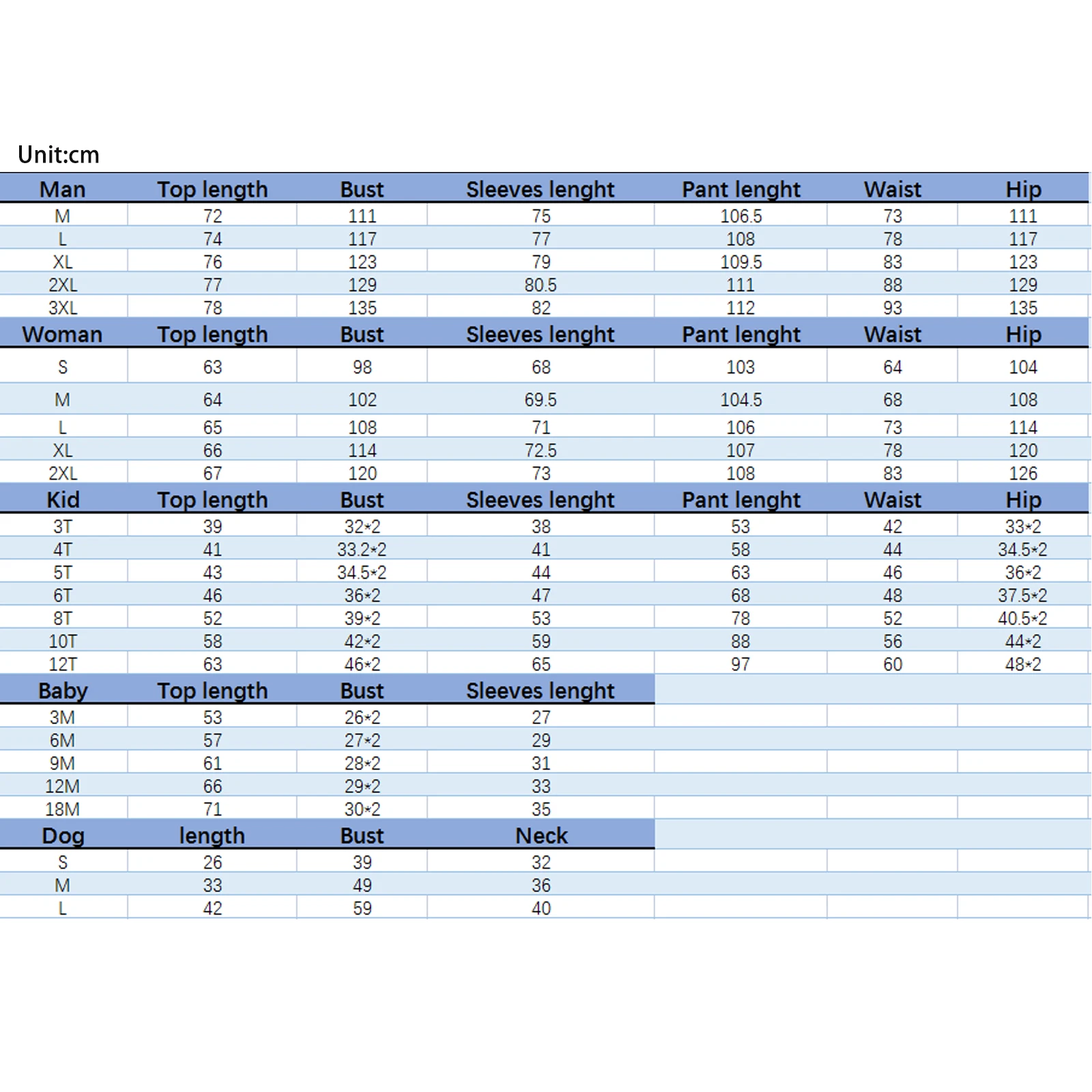 Size: Mom: S, M, L, XL, XXL, Dad: M, L, XL, XXL, XXXL, Kid: 3 Years, 4 Years, 5 Years, 6 Years, 8 Years, 10 Years, 12 Years, Baby: 3 Months, 6 Months, 9 Months, 12 Months, 18 Months, Dog: S/M/L