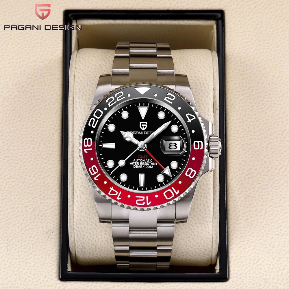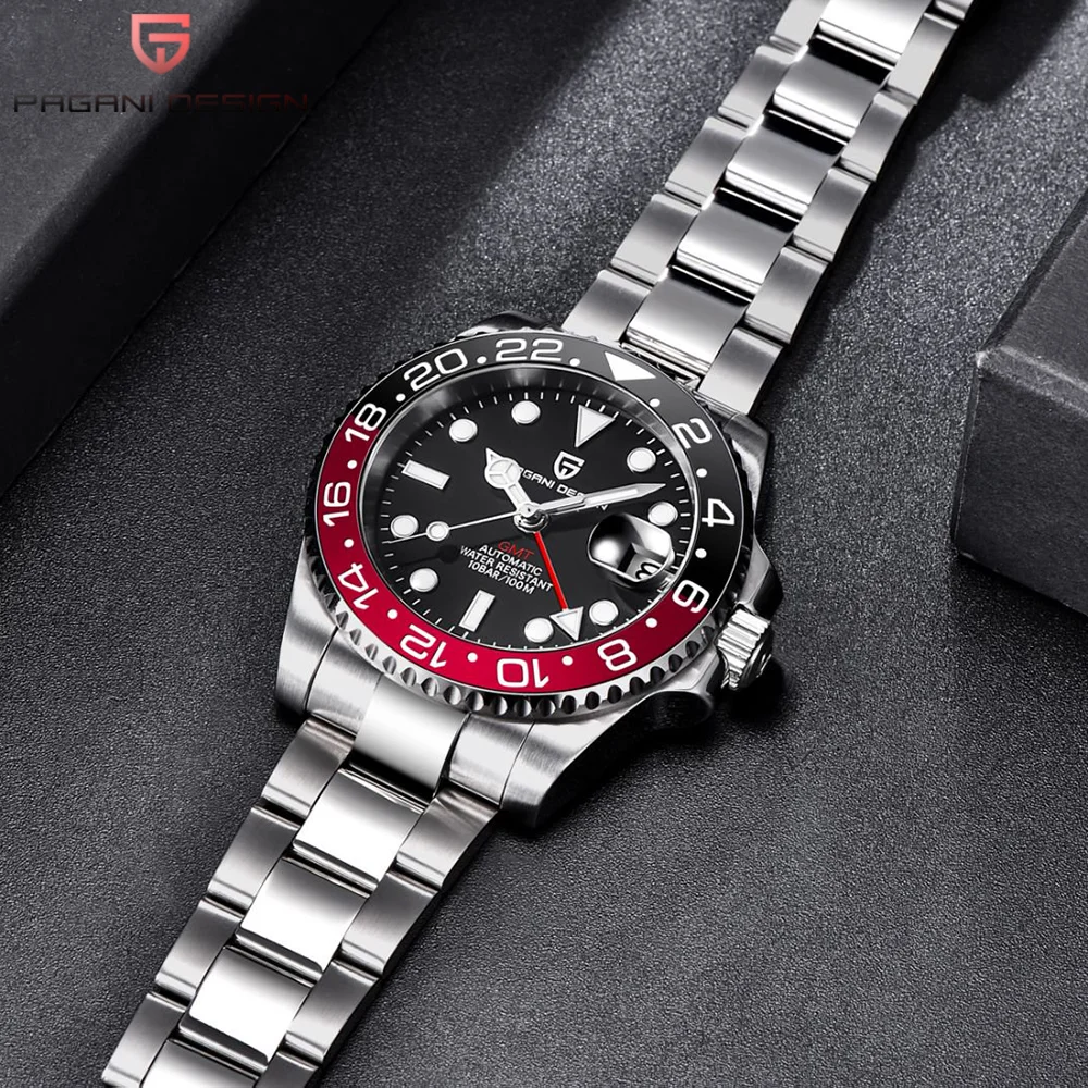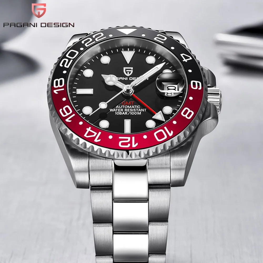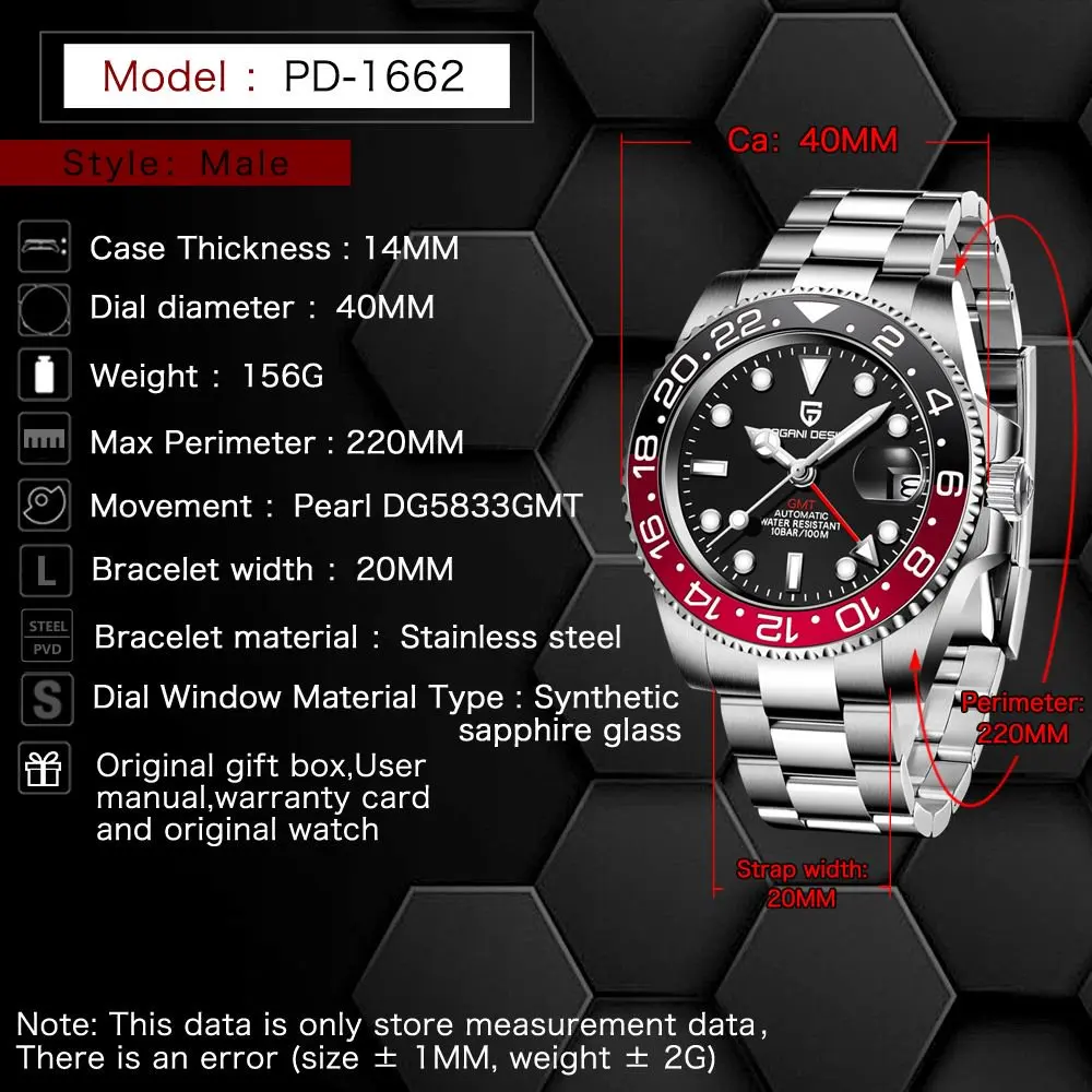 Pagani Design 1662 Men's Watch: Pagani Design GMT features a black dial, ceramic bezel (except for the red bezel which is not ceramic), independent 24-hour hands, and a 24-hour scale with a bi-directional rotating outer ring, which can display time in two time zones simultaneously. The simple design of the date display on the dial creates a simple and high-quality appearance. (Please note that the bezel of the red series is not made of ceramic)