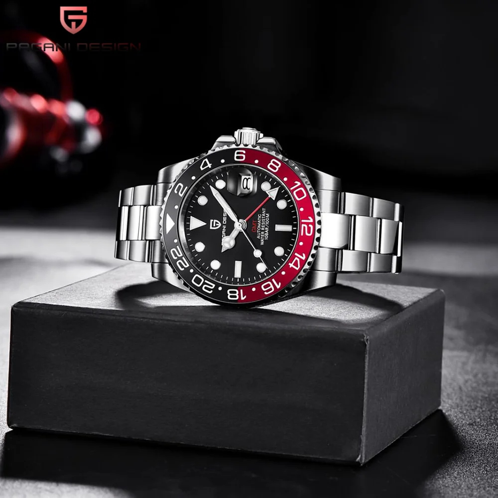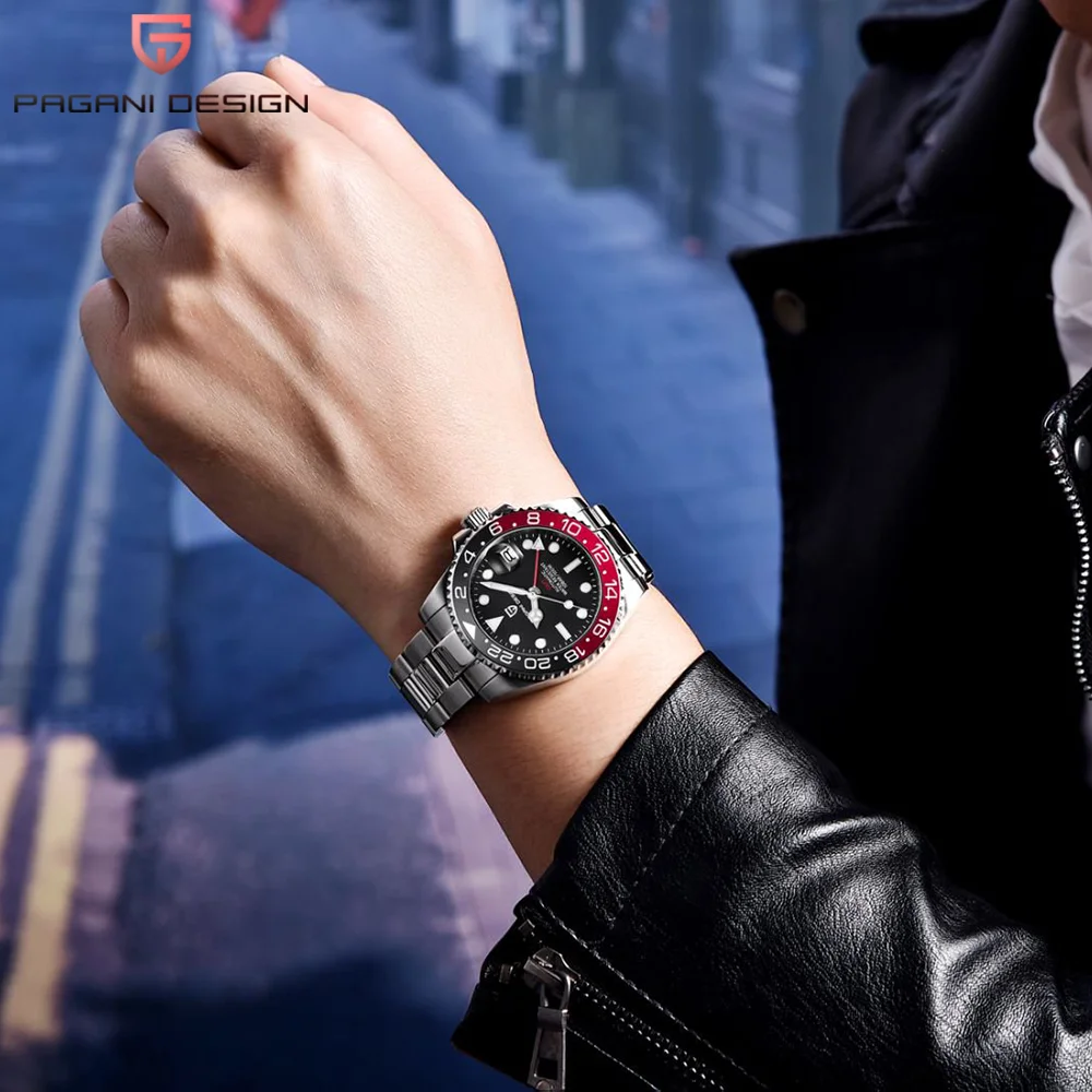 PAGANI DESIGNS first dual time zone chronograph with GMT function, 40mm stainless steel case with black-blue bezel, rotating ceramic bezel and black dial, sapphire crystal that protrudes like a magnifying glass and allows a clear view. Wearing this watch, you can not only see its softness and joy in real life, but also feel the infinite imagination of an extraordinary journey. The GMT hour hand is a thoughtful solution to jet lag problems. Its excellent function, reliable performance and unique aesthetic design make it very popular among tourists and a must-have global travel watch.
