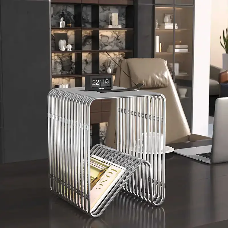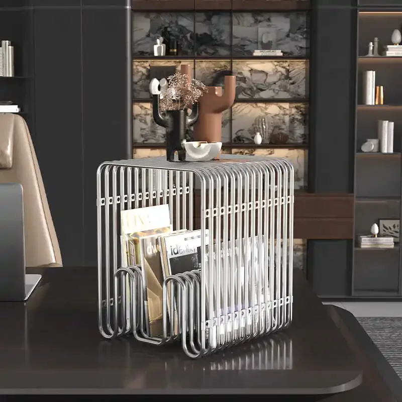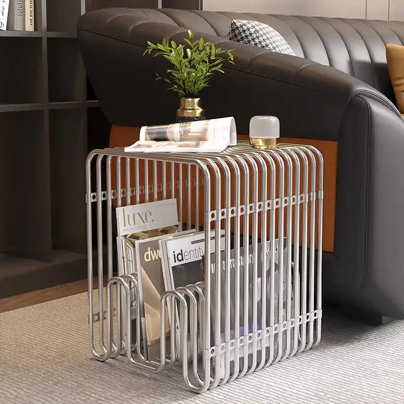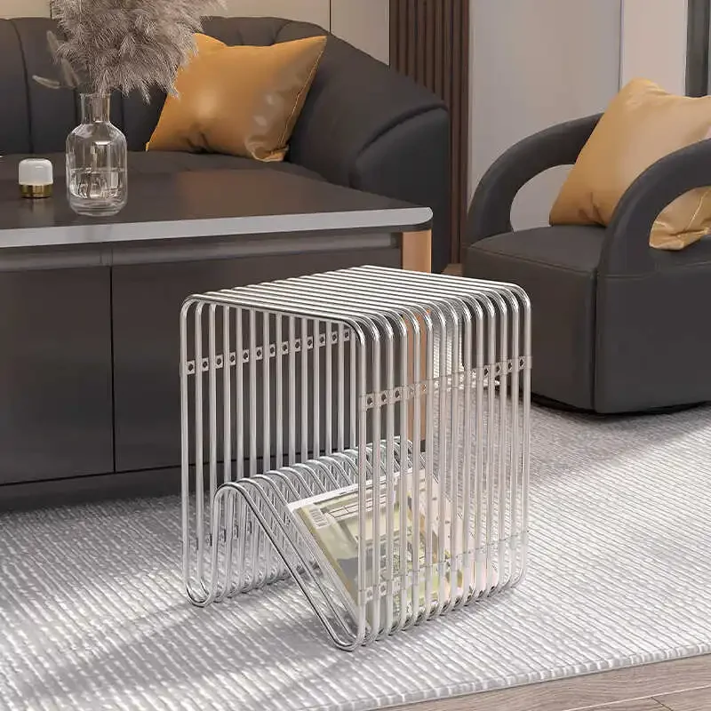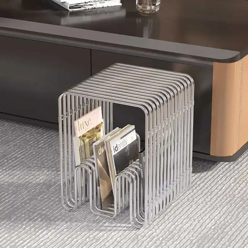 stainless steel magazine rack, Nordic side table, floor display shelf, minimalist magazine stand, luxury entryway organizer, stainless storage table, modern book rack, metal newspaper shelf, compact reading rack, decorative living room shelf