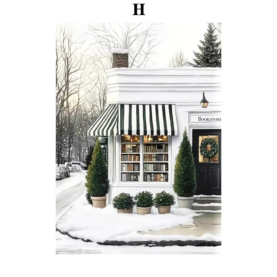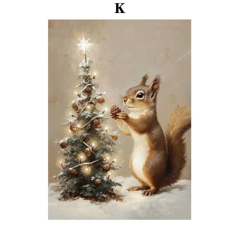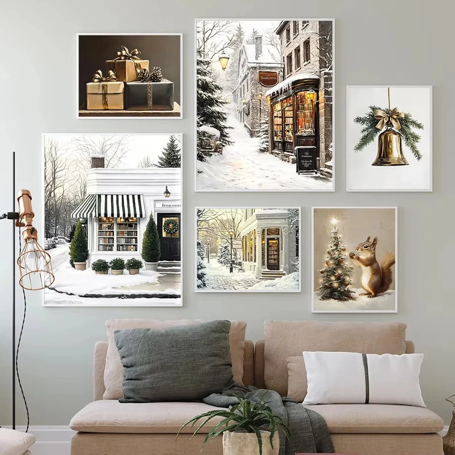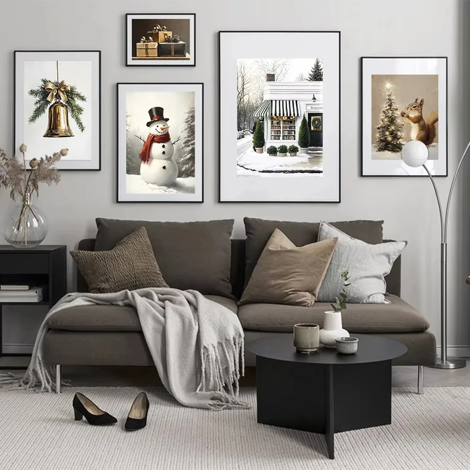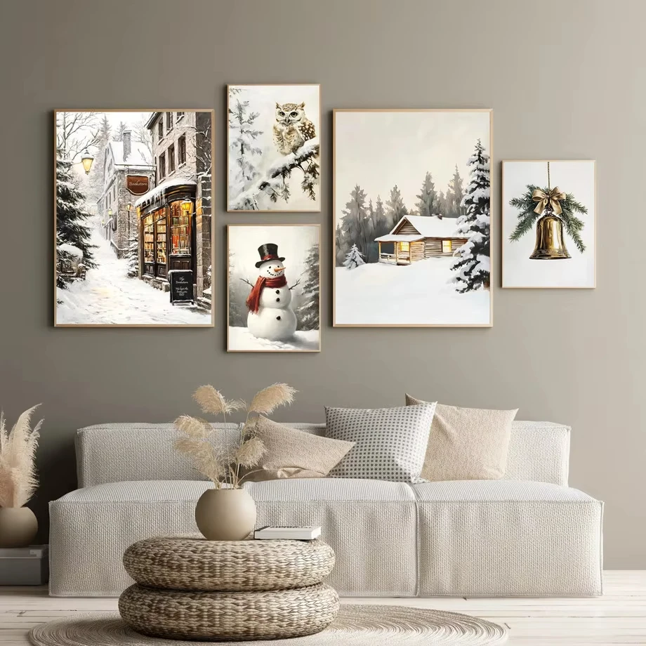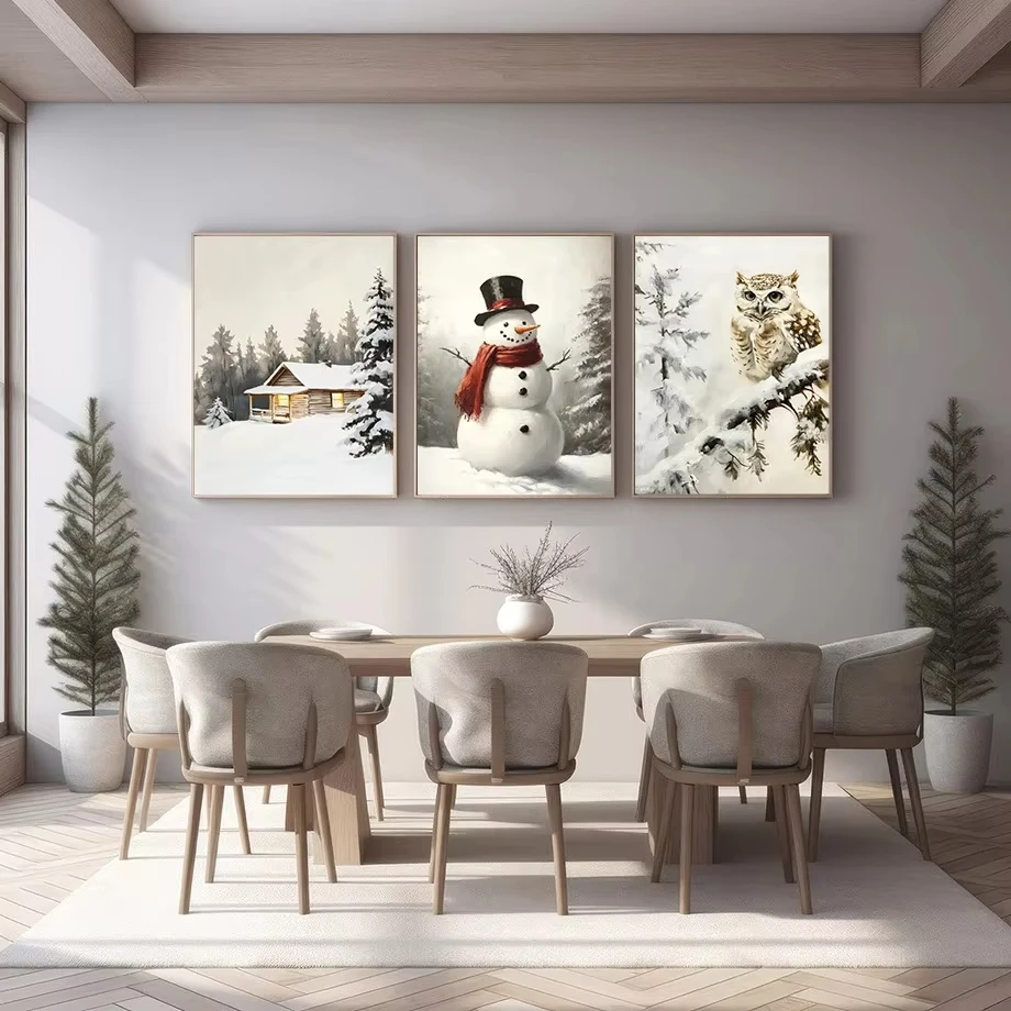 Nordic Winter Snow Scene Art Poster Snow-Covered Cottage, Snowman, Squirrel, Christmas Gifts Canvas Print Modern Home Room Decor