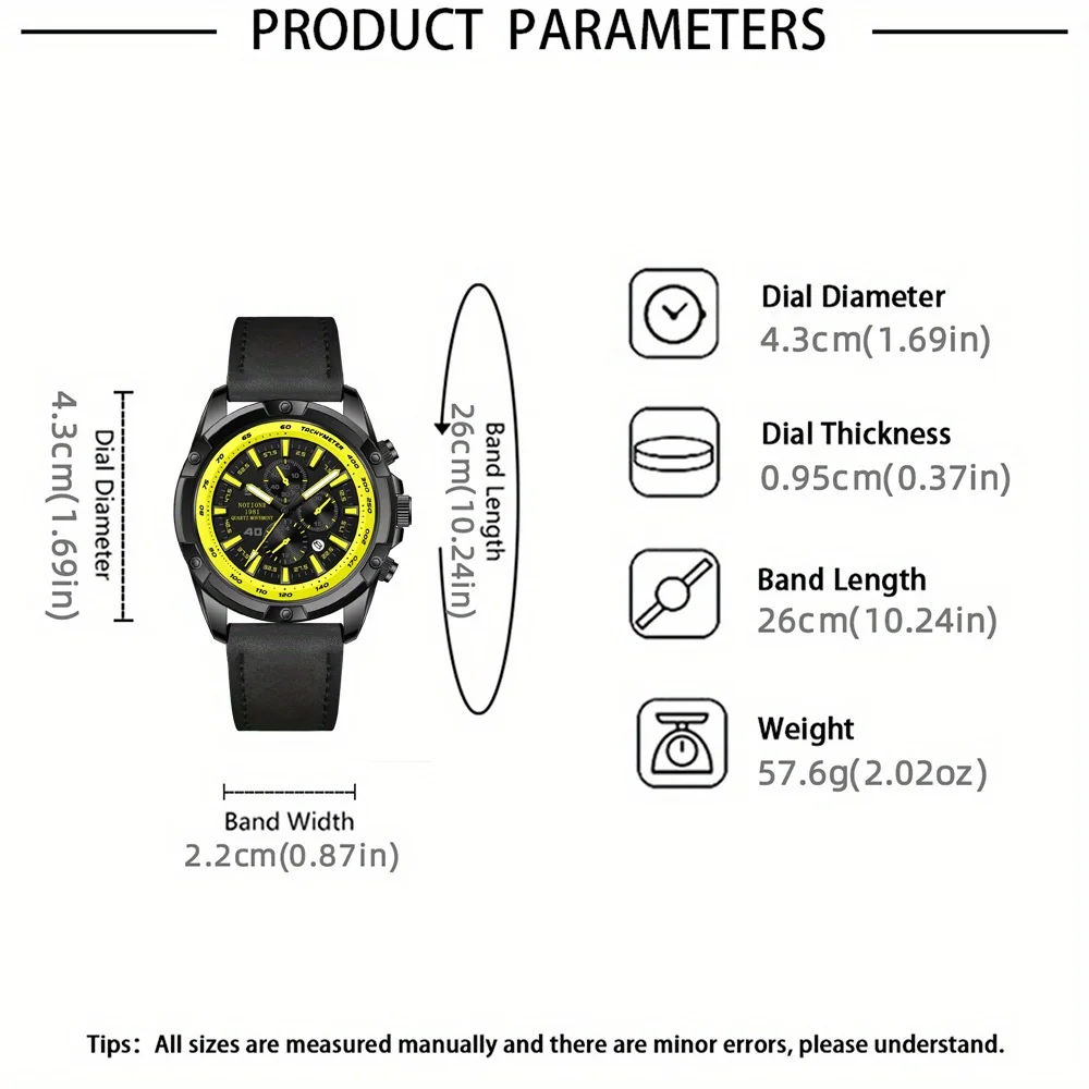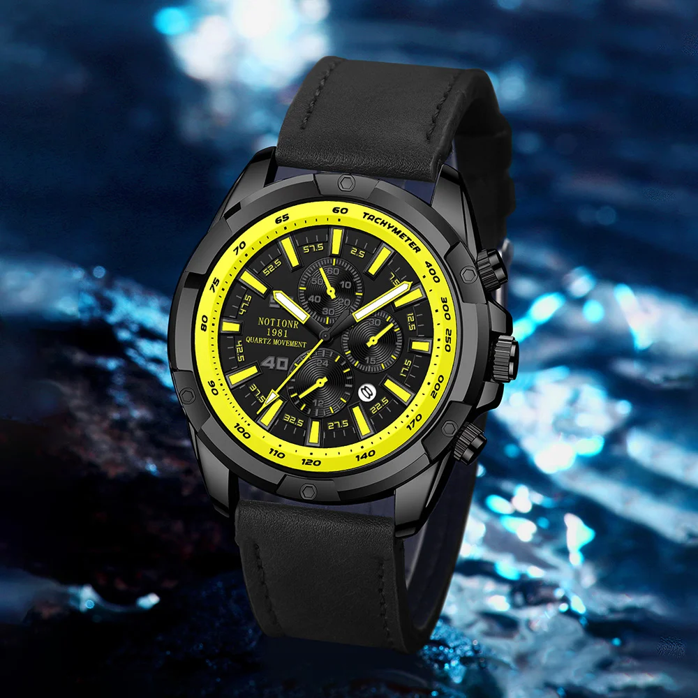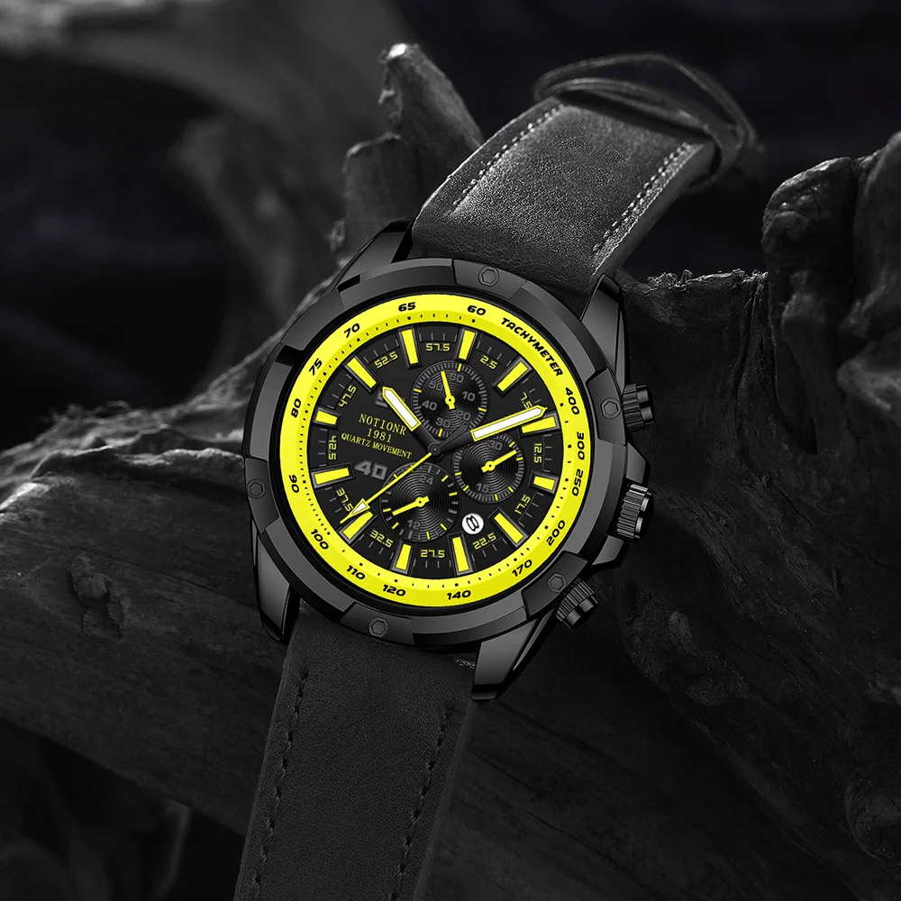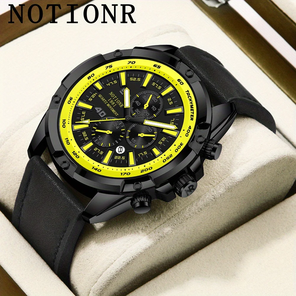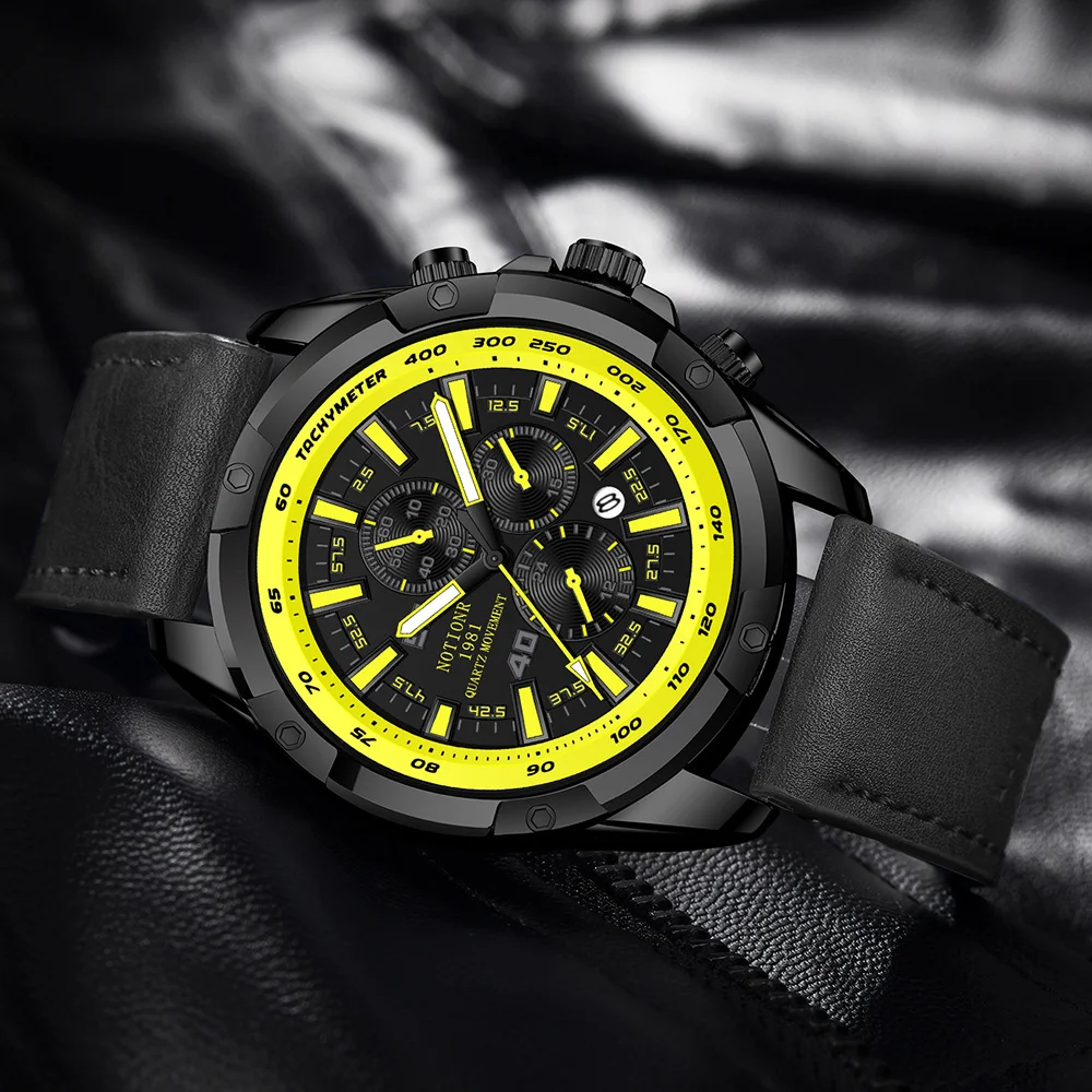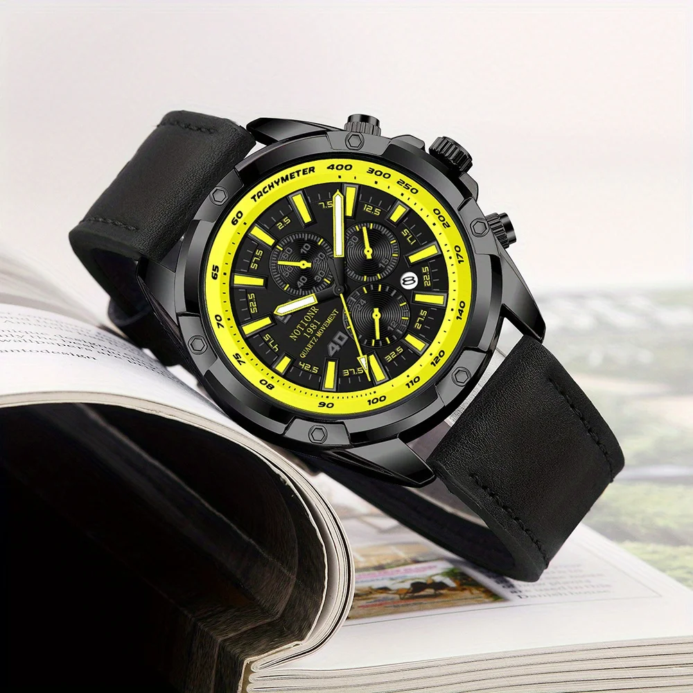 NOTIONR Men Watch Business Mens Fashion Yellow Dial Quartz Calendar Watches Analog Black PU Leather Casual Sports Watch Men