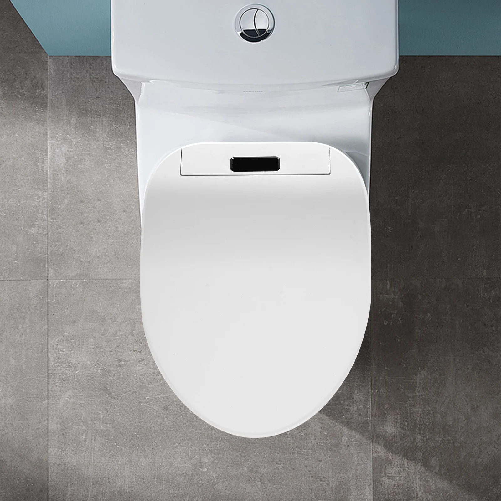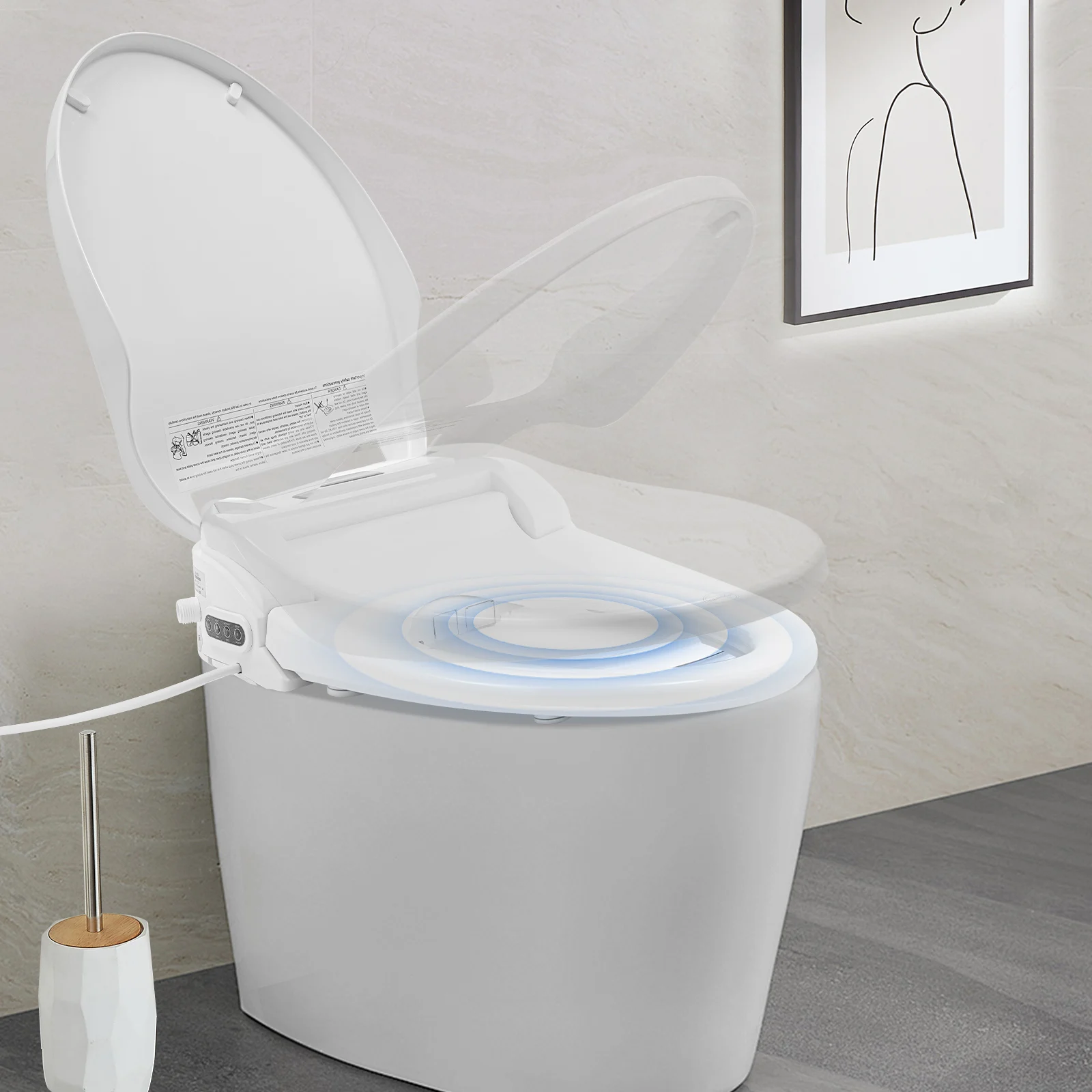 Advanced smart bidet toilet seat featuring heated seating (89-104°F), warm water cleansing, and dual control options (remote + side panel). With 6 cleaning modes including feminine wash and massage function, this V-shaped seat fits most toilets. Includes self-cleaning nozzles, LED night light, and energy-saving mode for ultimate bathroom comfort.