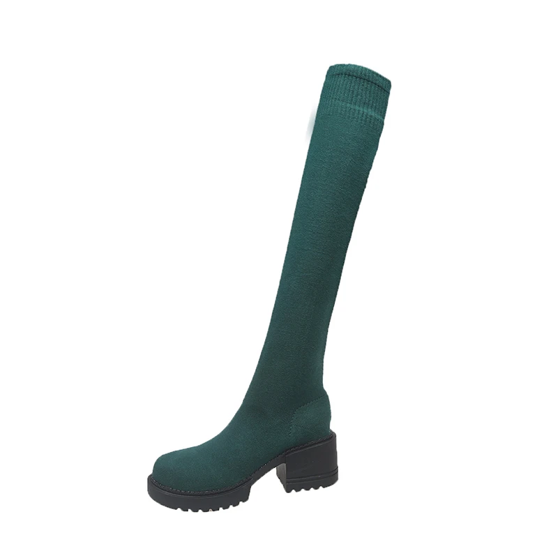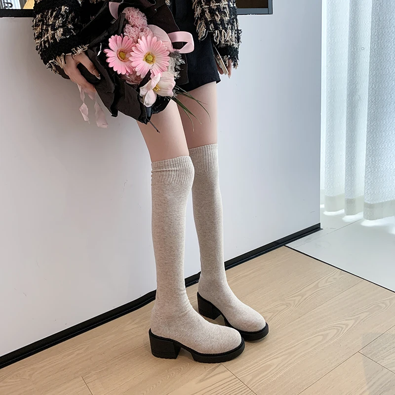 Thick Heel Over The Knee Sock Boots Women Elastic Knitting Long Boots Woman Comfort Slip on Platform Sock Shoes Plus Size 35-43