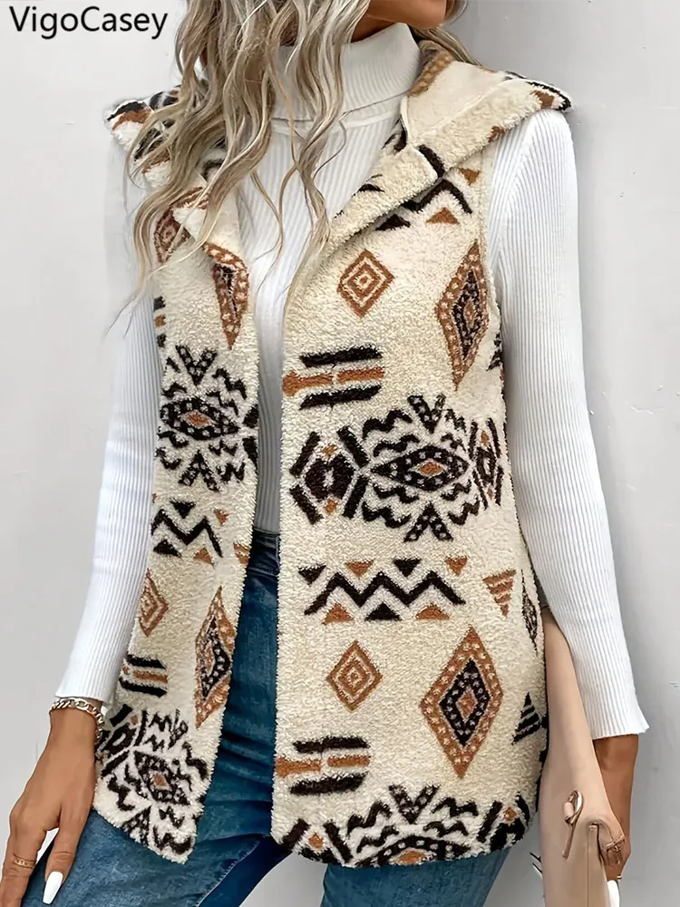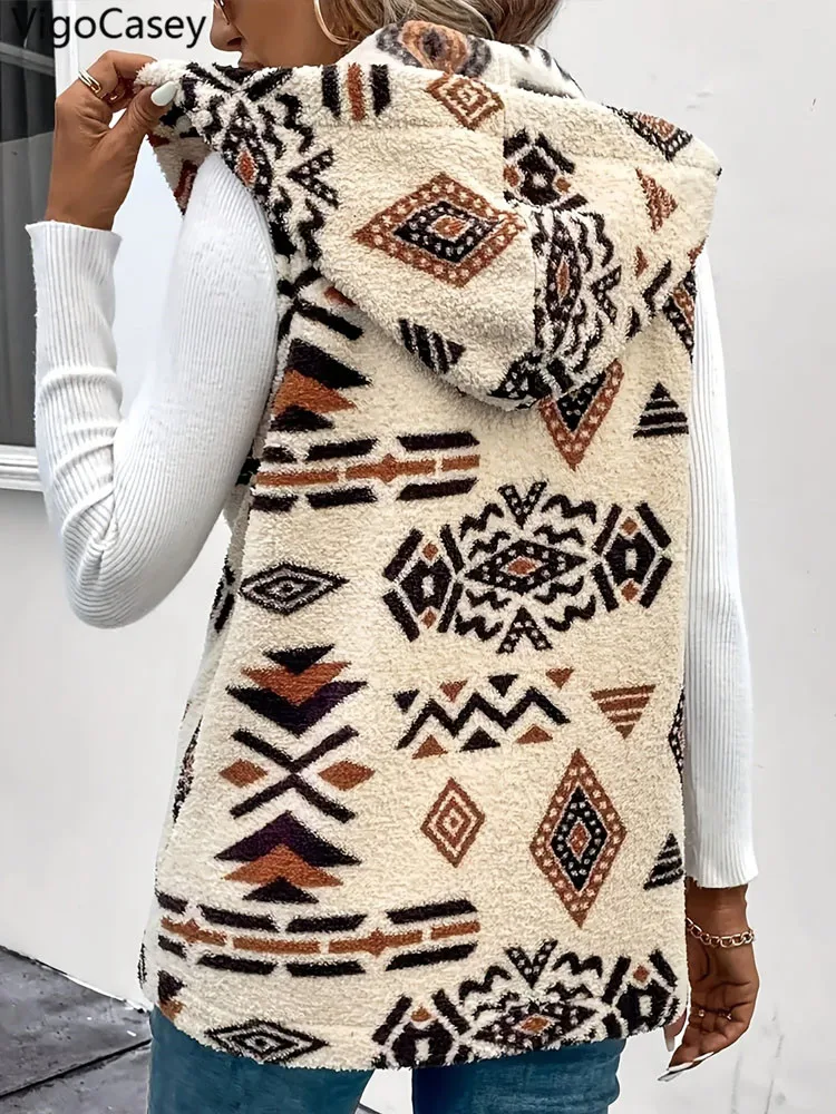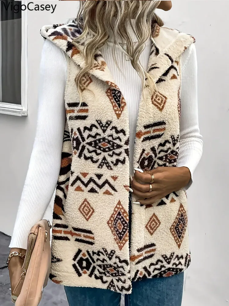 VigoCasey 2025 Loose Print Hooded Thick Vest Coat Woman Sleeveless Warm Plush Waistcoat Lady Autumn Winter Casual Vest Jacket