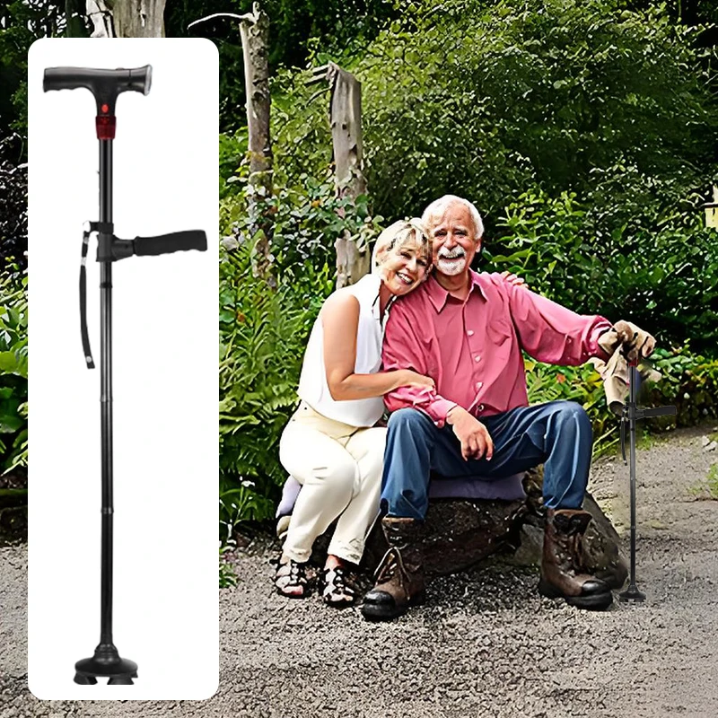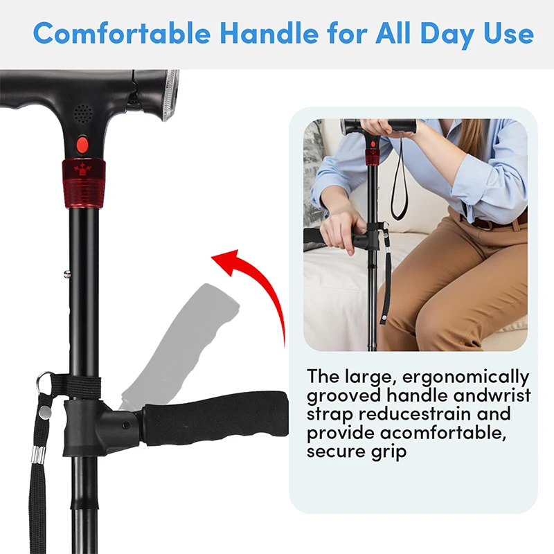 2,Comfortable and sturdy: The cane is made of aluminum and can stand on its own, providing maximum safety and durability while remaining light. The soft handle is combined with a convenient wristband to provide optimal comfort and support, non-slip, relieve pressure on the wrist and prevent muscle spasms. The cane also has an alarm, and when the elderly are in danger, you can press a button to make a sound to keep you safe.
