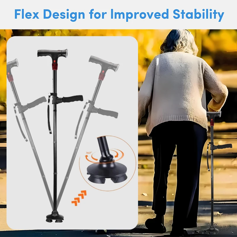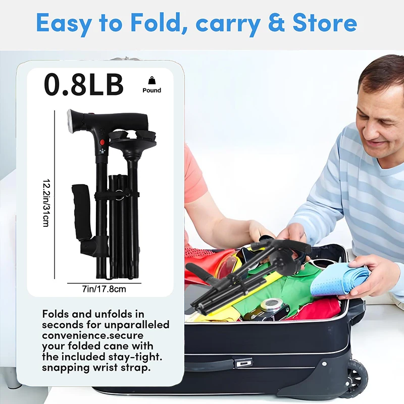 5,Safety and non-slip: The folding cane has a non-slip rubber tip at the bottom to prevent falls and ensure your safety. The 360-degree rotating quadrilateral base provides extra traction and stability so that the cane won’t slip if you’re on wet roads or in all terrains, giving you the flexibility to walk, run and turn easily.