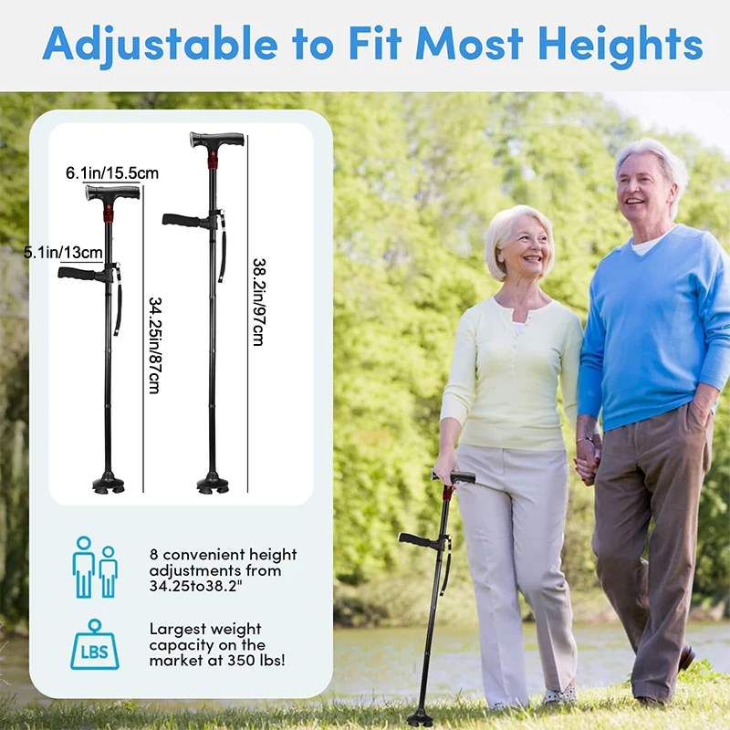 1,Collapsible design: Our canes can be easily adjusted at the touch of a button. The cane can adjust the height from 34″ to 38″, which is probably suitable for most people between 5.3′ and 6.3′.The weight of the cane is 0.8lb, while the aluminum cane provides maximum safety to handle up to 300 lbs.