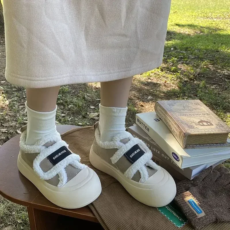 Winter Women Breathable Warm Sneakers White Wool Shoes Thick Heel Plaid Sneakers Casual Running Platform Lolita Shell Shoes