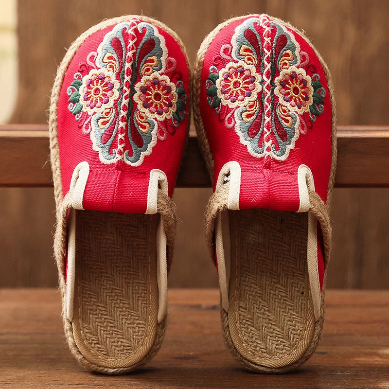 Women Casual Linen Handmade Embroidery Mules Flat Slippers Retro Vegan Summer Ladies Canvas Comfortable Espadrille Shoes