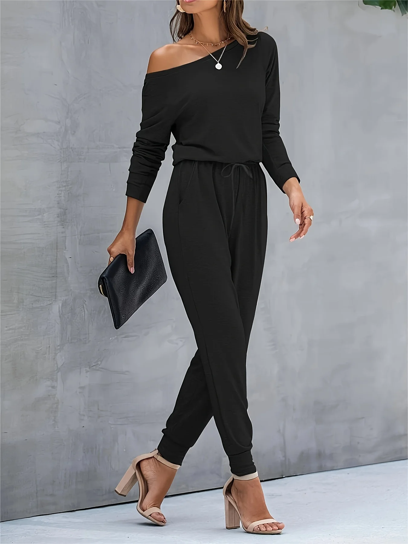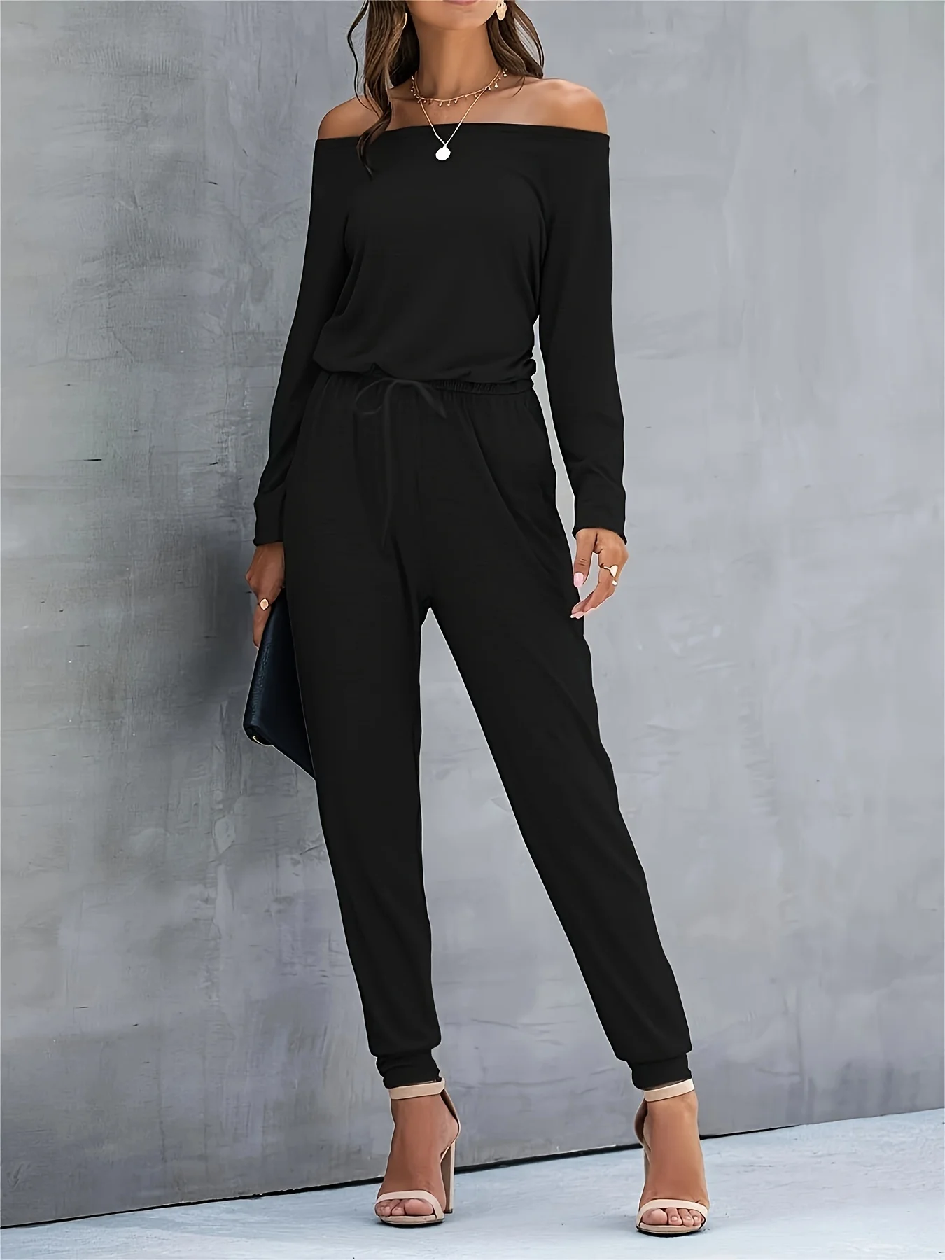 This women's black off-shoulder long sleeve jumpsuit exudes elegance with its solid pattern and lace-up decoration, perfect for a casual yet stylish look.